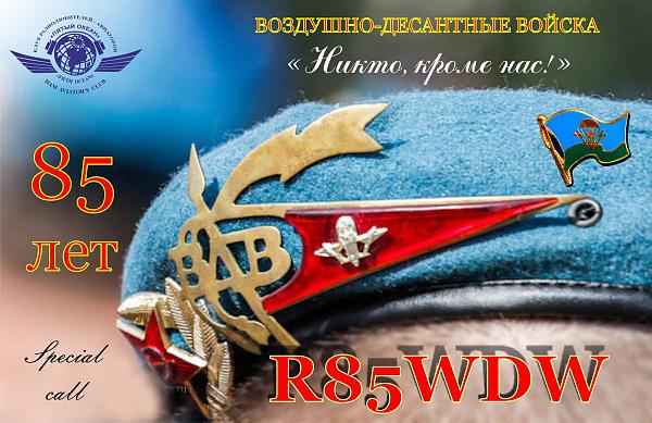 В ознаменование 85 годовщины создания ВДВ России международный клуб радиолюбителей-авиаторов "Пятый Океан" с 1-го по 9 августа проводит дни активности. В эфире временный специальный позывной R85WDW . Приглашаются все радиолюбители России, стран СНГ и дальнего зарубежья для проведения радиосвязей со специальными позывными, позывными радиолюбителей ВДВ и членами клуба "Пятый Океан". Клубом "Пятый Океан" учрежден диплом "Никто, кроме нас". Диплом будет выдаваться через http://aviaham.hamlog.ru Учреждены дополнительные награды: памятная плакетка, памятная медаль, памятный вымпел. Условия награждения в условиях диплома на http://aviaham.hamlog.ru